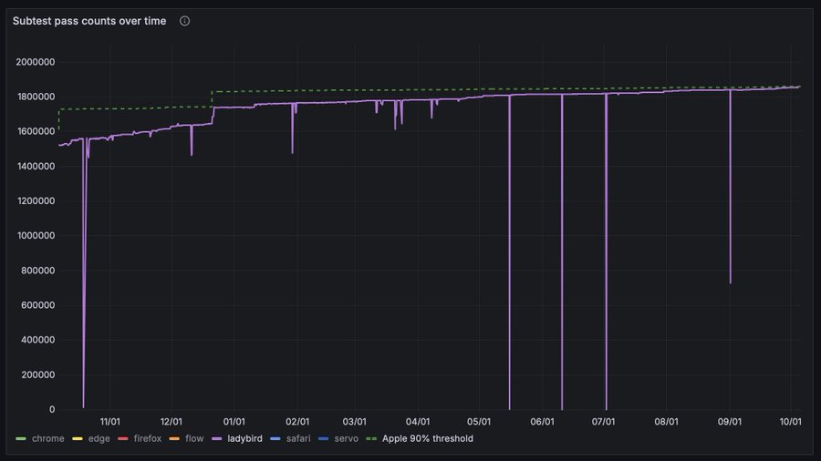 Андреас Клинг (Andreas Kling) сообщил об успешном прохождении браузером Ladybird 90% тестов из набора web-platform-tests, определяющих совместимость с эталонной web-платформой. В соответствии с требованиями Apple достигнутого рубежа достаточно чтобы считаться альтернативным браузерным движком для iOS. Ladybird успешно прошёл 1 861 180 проверок из 2 033 861. Для сравнения Chromium 139 прошёл 1 996 034 проверок, Firefox 143 - 1 942 510, Safari 26.0 - 1 952 703, Servo - 1 672 466.
